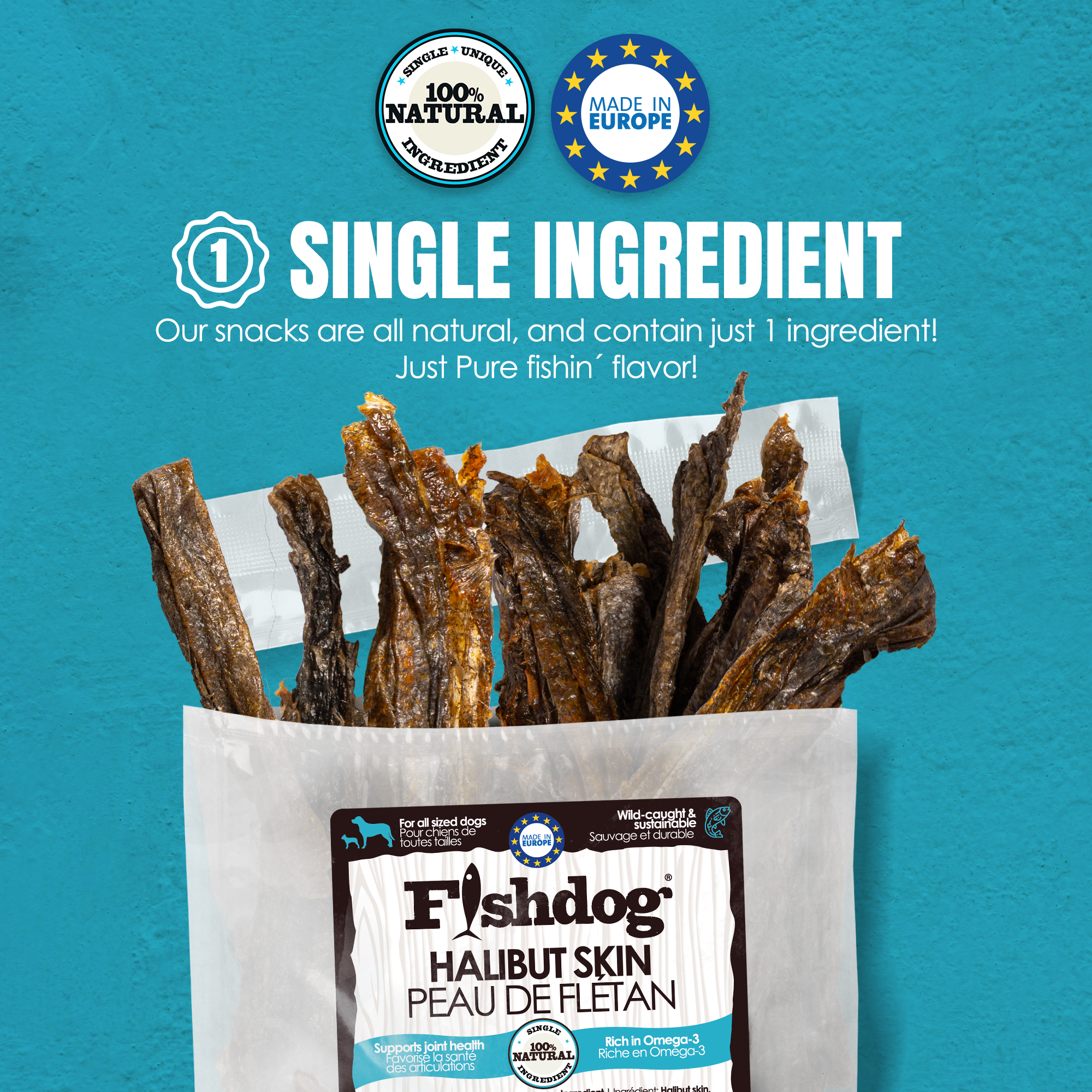 Sourced from wild-caught halibut and gently air-dried, these treats offer a naturally crunchy chew packed with protein and Omega-3 fatty acids.