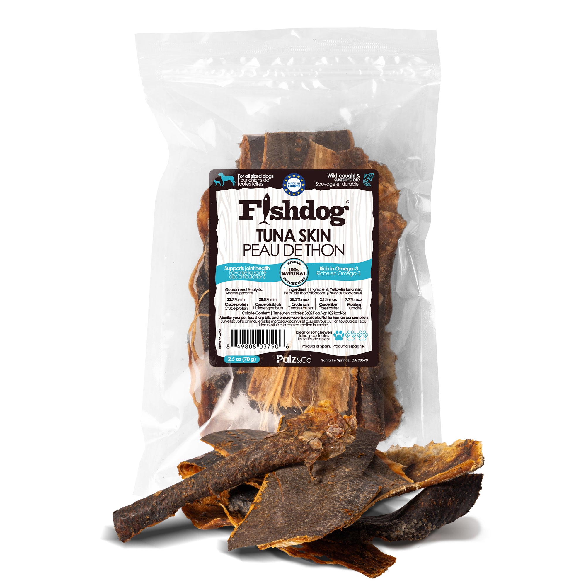 FishDog Tuna Skin Treats by Palz&Co are made from 100% wild-caught tuna skin - air-dried to preserve nutrients and lock in irresistible fish flavor.