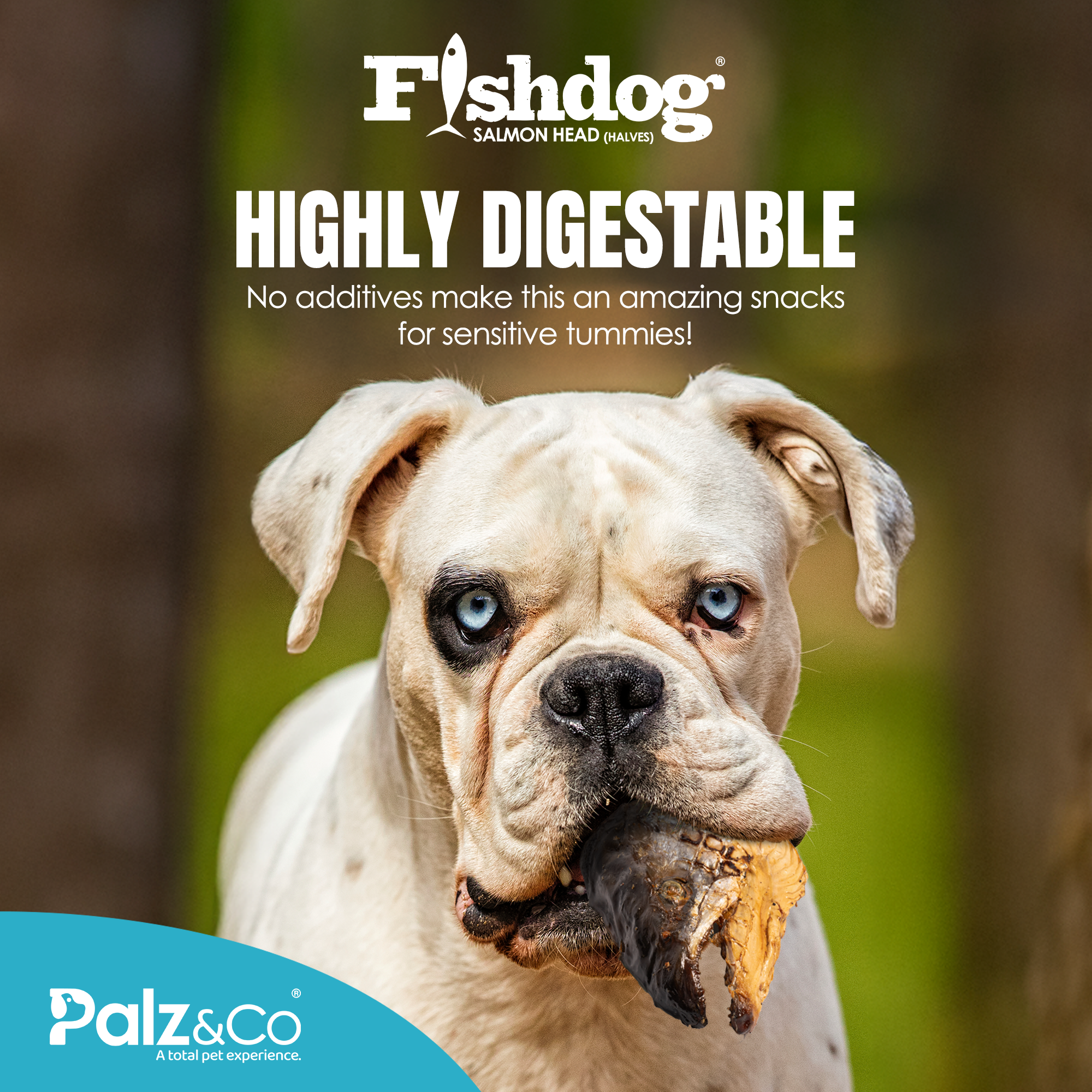 Treat your dog to a powerful source of natural nutrition with Fishdog Salmon Head Dog Treats by Palz & Co. These air-dried halves of wild-caught salmon heads are packed with healthy fats, protein, and calcium making them a fantastic functional chew that supports total-body wellness.