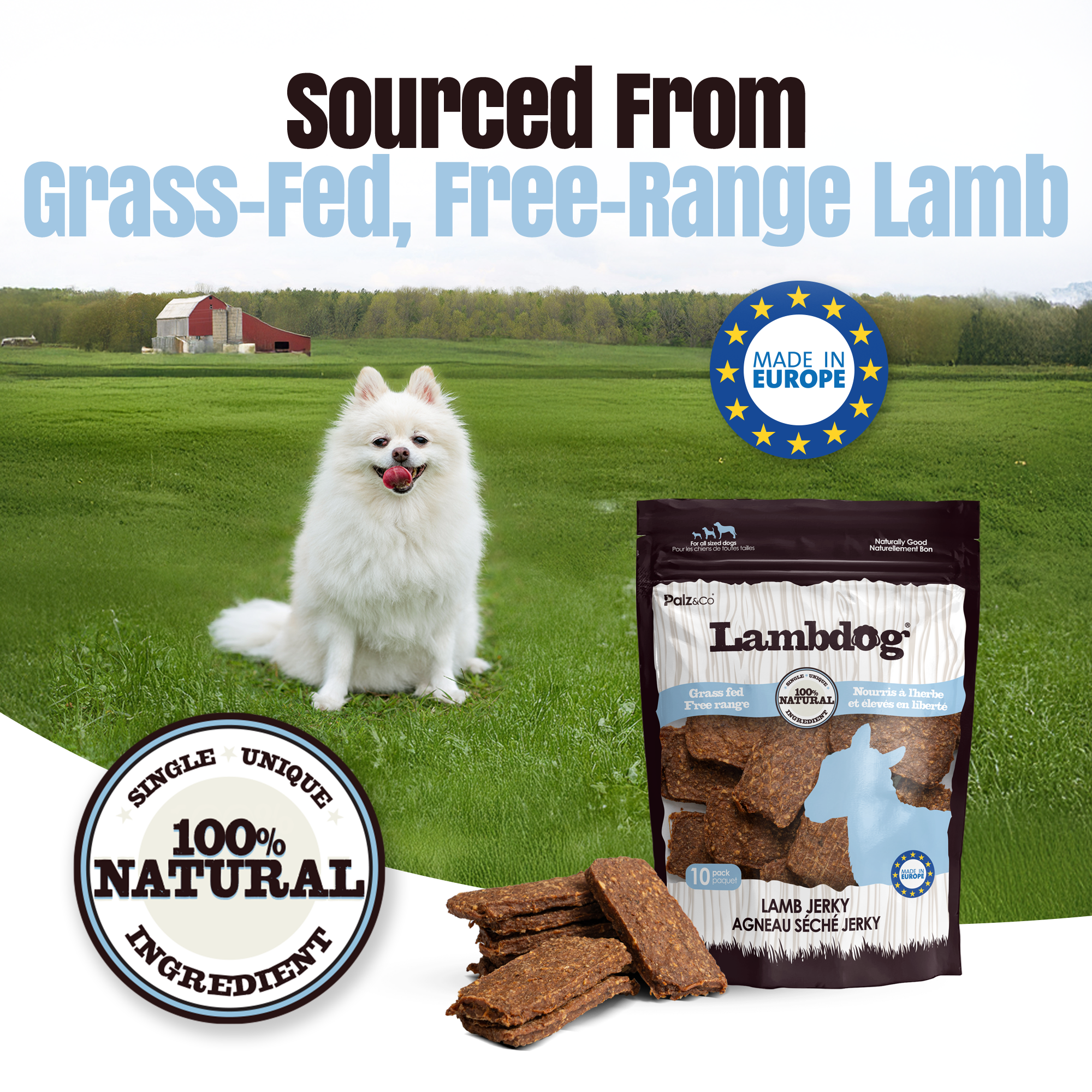 Lambdog Jerky provides a delicious treat and healthy chew treat for your pup. Sourced from Europe (Romania)
