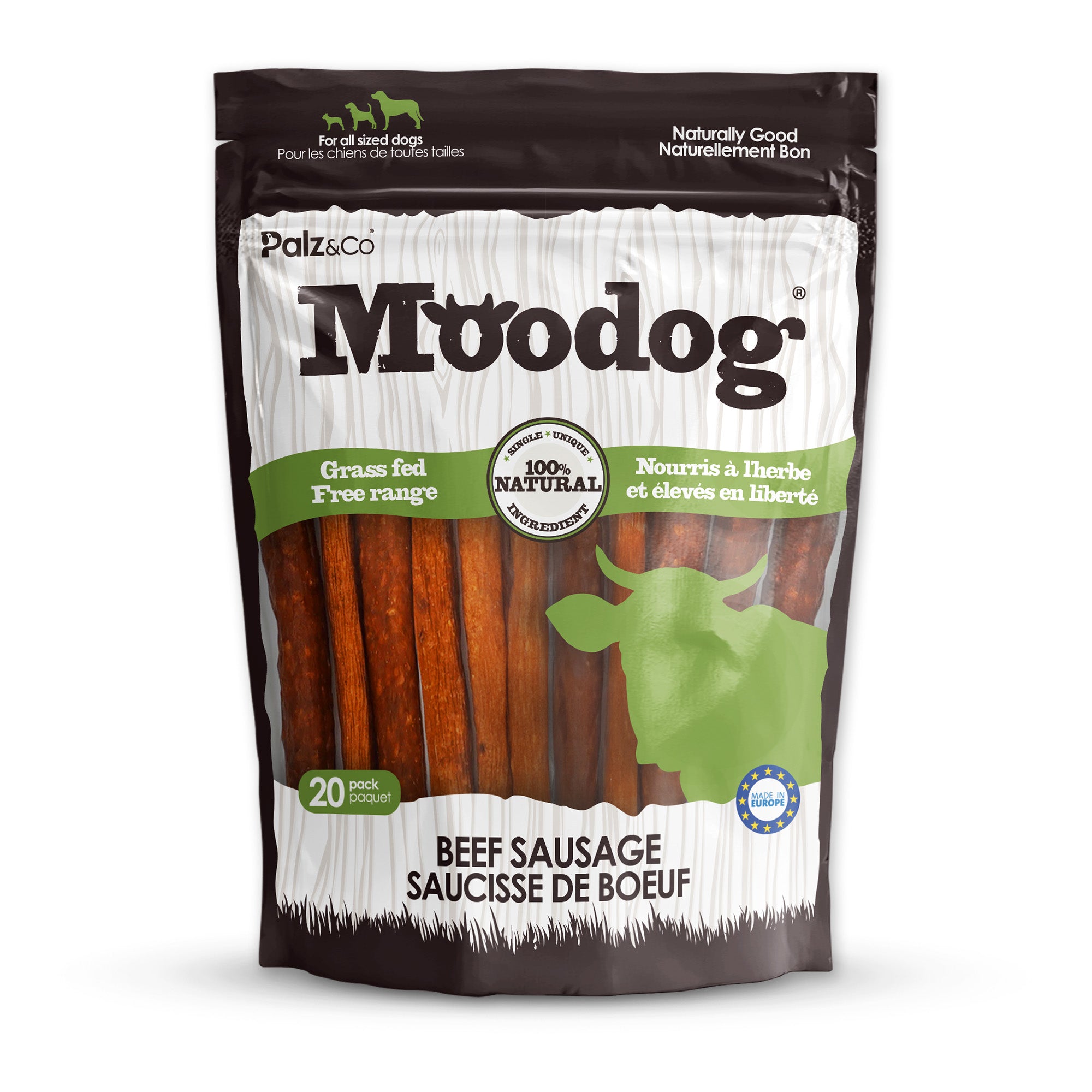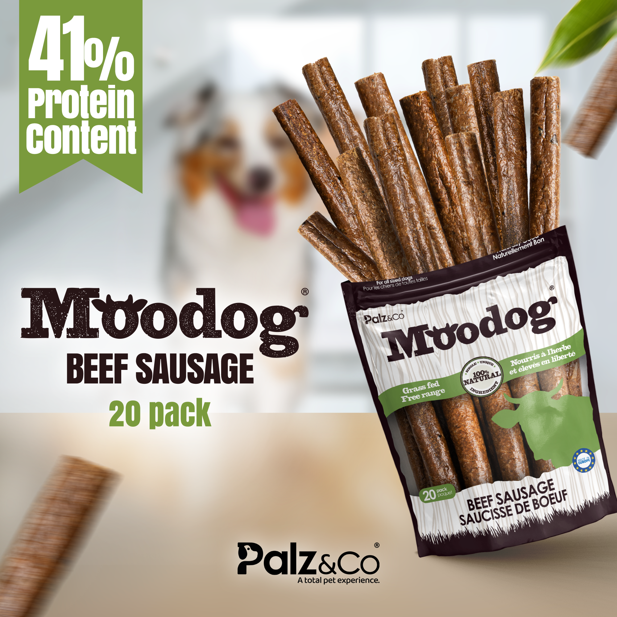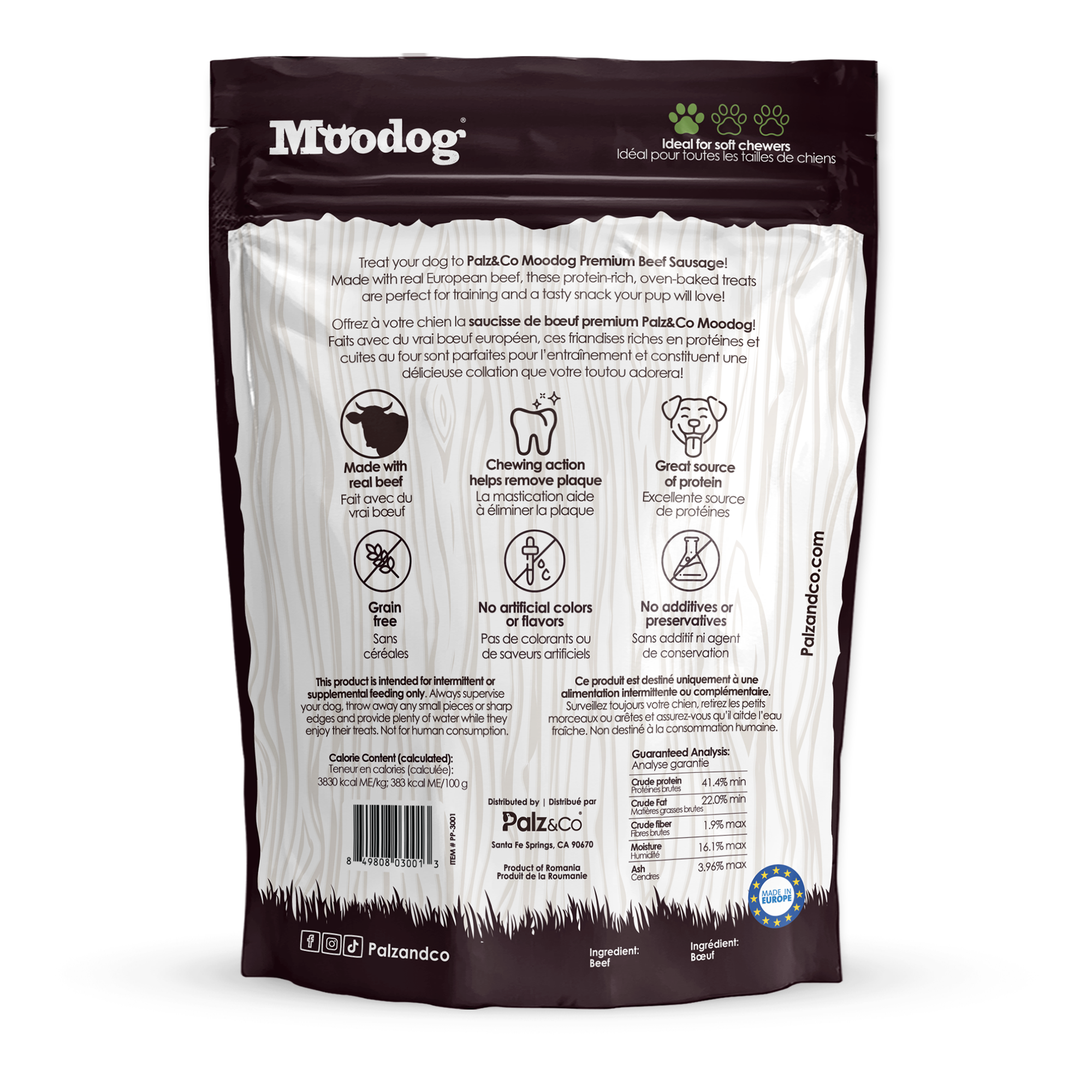 Support your dog’s health with every bite of Moodog Beef Sausage Treats. Made from premium European-sourced beef and slow-baked to perfection, these tender, protein-packed sausages are designed to promote overall well-being. The naturally chewy texture satisfies your dog’s instinct to chew, helping to clean teeth, reduce plaque buildup, and support better dental health. Chewing also helps relieve stress and anxiety, promoting a calmer, happier dog. Packed with essential nutrients and completely grain-free, Moodog Beef Sausage Treats contain no artificial colors, flavors, additives, or preservatives - making them a wholesome choice for dogs of all ages and sizes. Give your pet a delicious treat that supports their health inside and out. Sold in 8-pack and 20-pack bags.