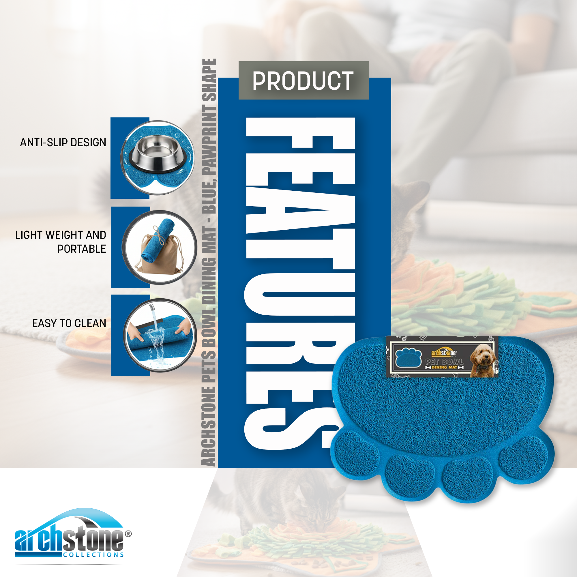Make mealtime mess-free with our Archstone Pets Dining Mat! This practical and stylish dining mat is the ultimate solution to keep your floors spotless during mealtime. Designed to hold both food and water dishes, it’s perfect for home use or travel. Whether you’re at home or on the go, this mat makes cleanup easy, simply wipe it down or toss it in the dishwasher for a quick and hassle-free cleanup! Featuring a fun pawprint design in a vibrant blue color, this mat is as functional as it is charming.