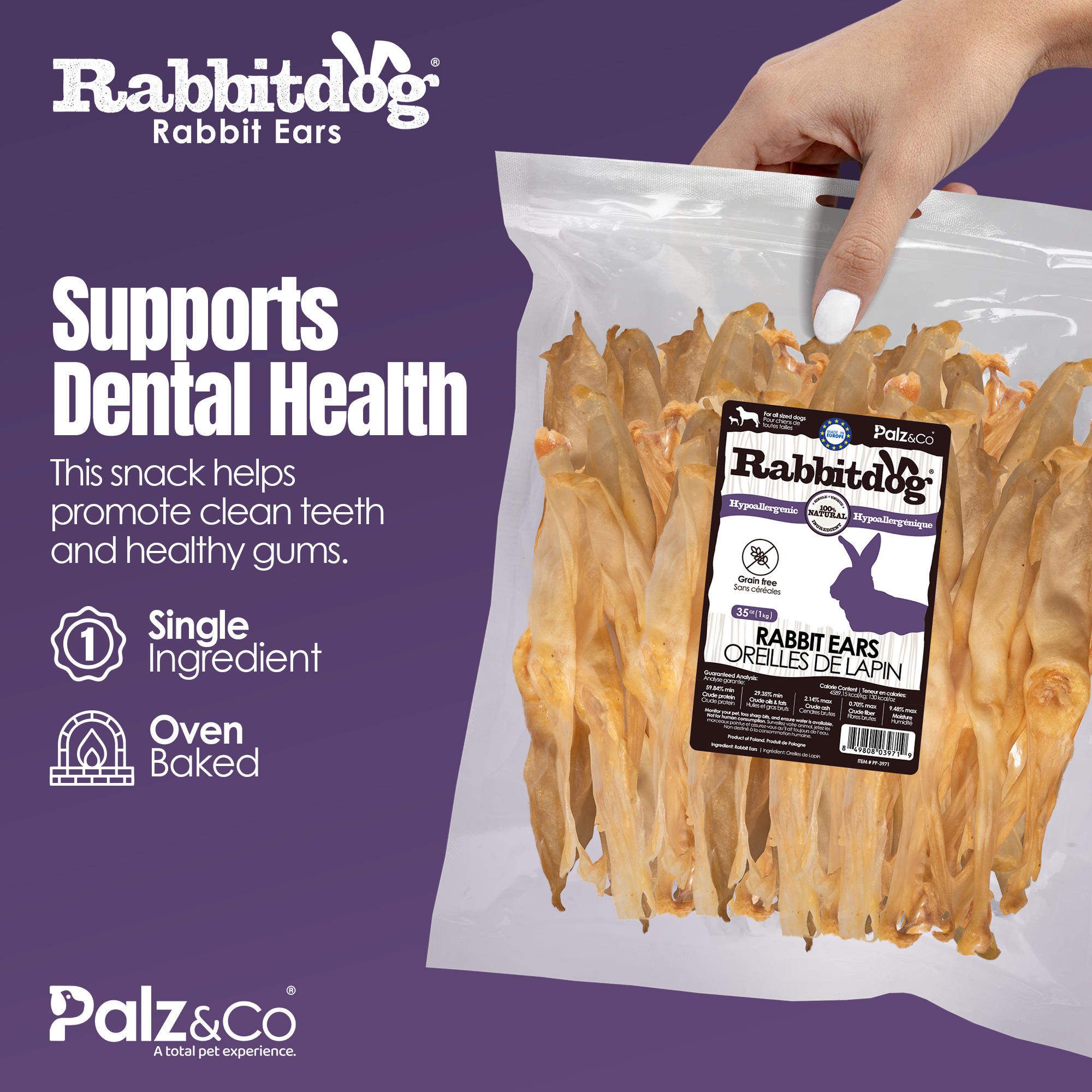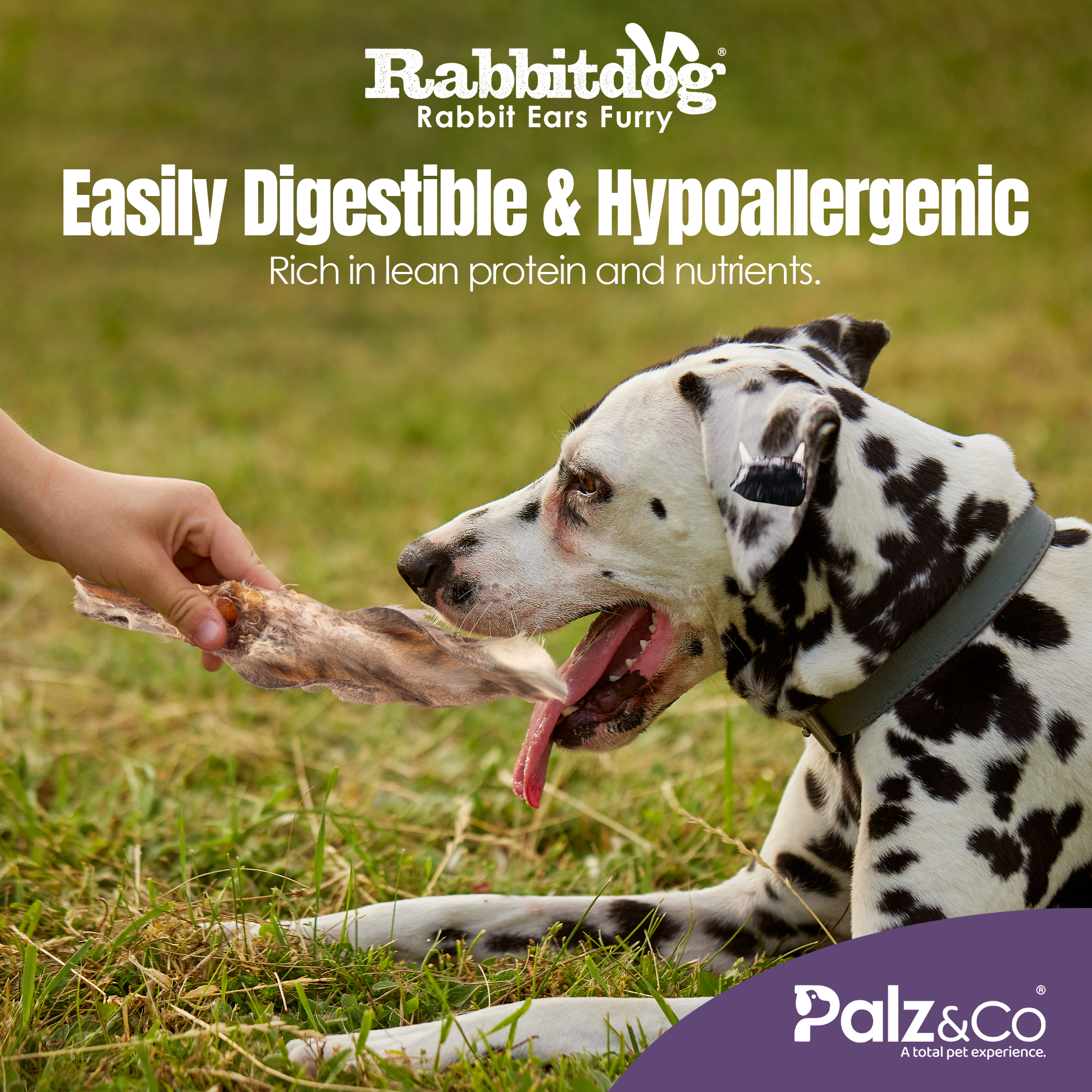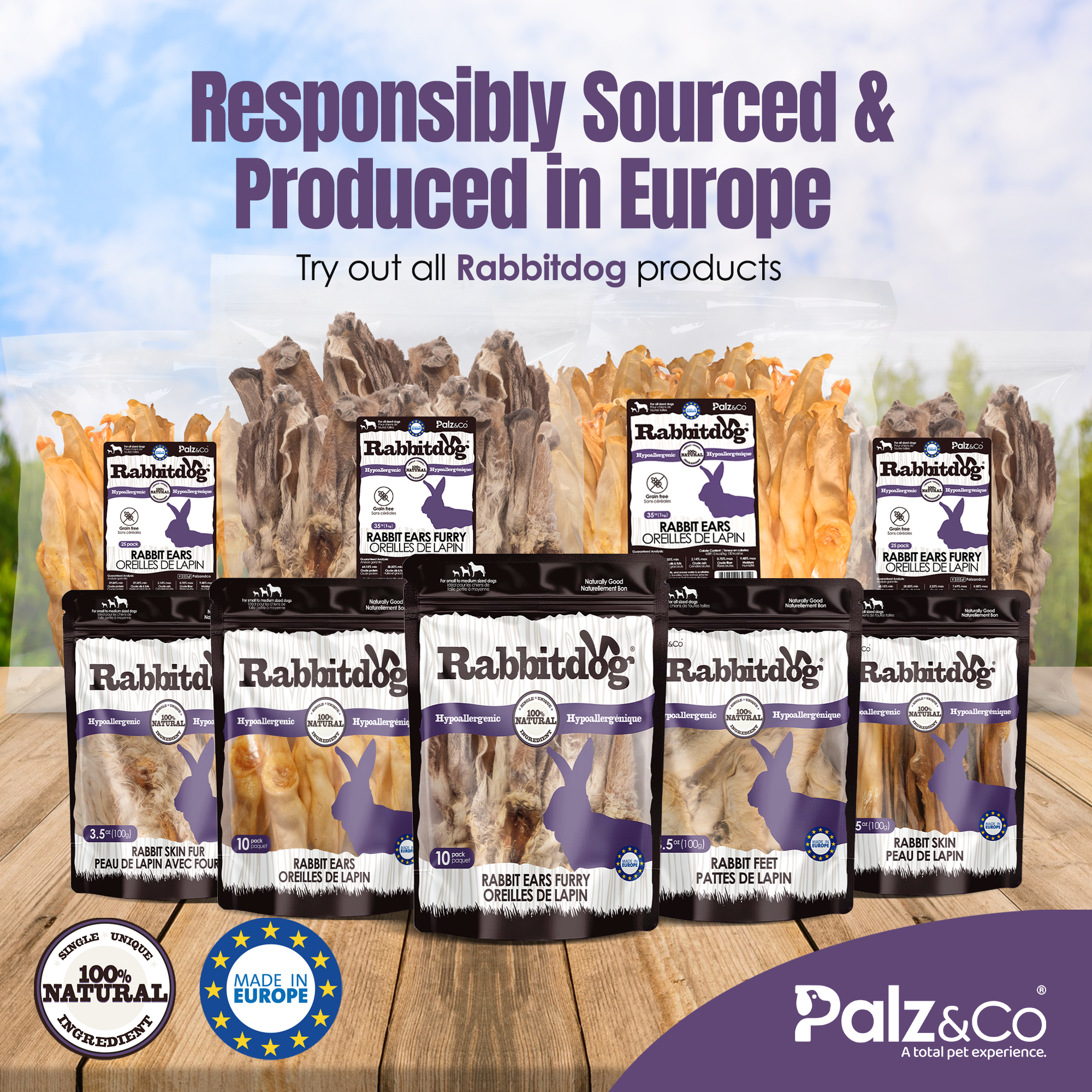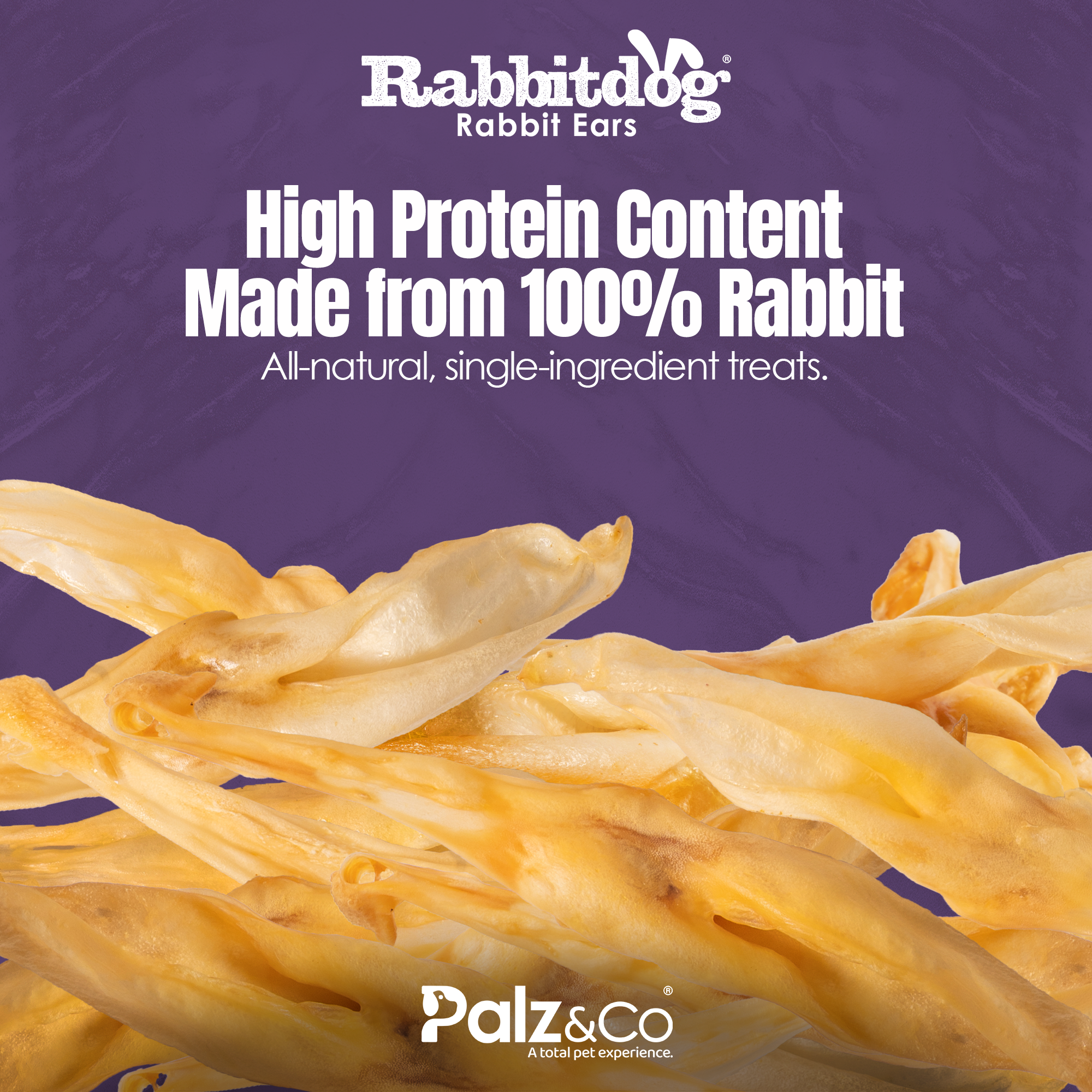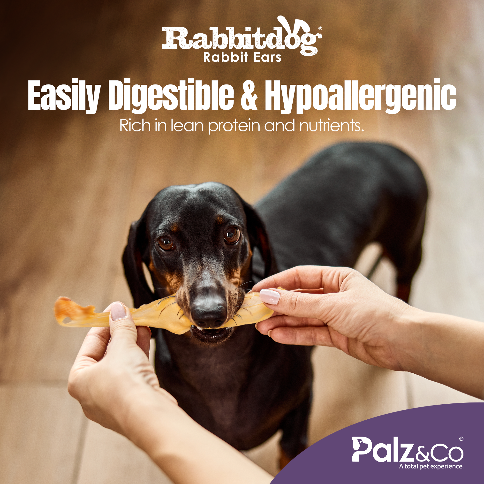 RabbitDog Rabbit Ears are hypoallergenic, single-ingredient treats made from 100% European rabbit, perfect for dogs with food sensitivities or limited-ingredient diets.