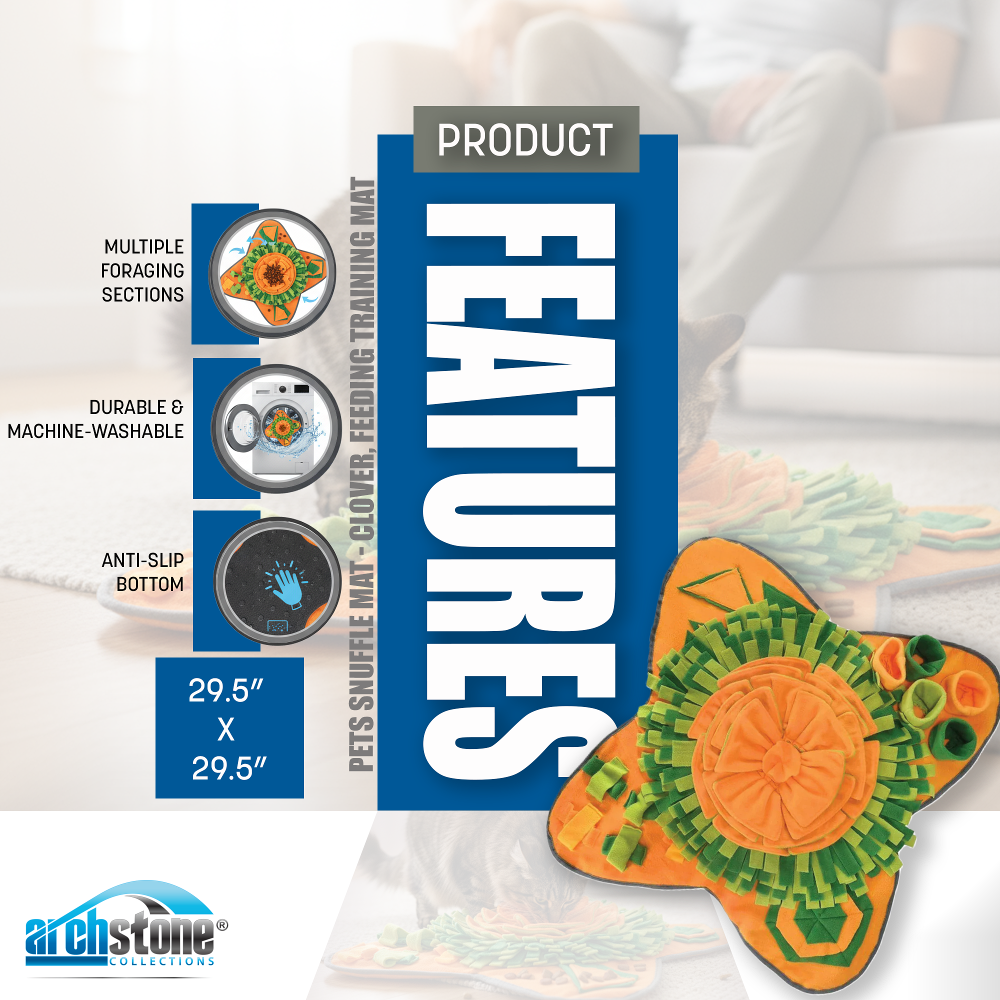 Enhance your pet’s natural foraging skills and keep them entertained with our Archstone Pets Snuffle Mat. This unique training mat allows you to hide snacks, kibble, or fun accessories throughout, promoting mental stimulation and engaging your pet for extended periods. Crafted from durable polyester fabric, the large 29.5” x 29.5” mat features multiple foraging sections for varied entertainment. Plus, its machine-washable design makes cleanup a breeze, keeping your pet’s favorite playtime mat ready for action again and again!